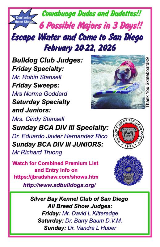 - The members of the Bulldog Club of San Diego County want to thank everybody who helped make our 2025 Specialty Weekend concurrent with the Silver Bay Kennel Club All Breed Shows a huge success!